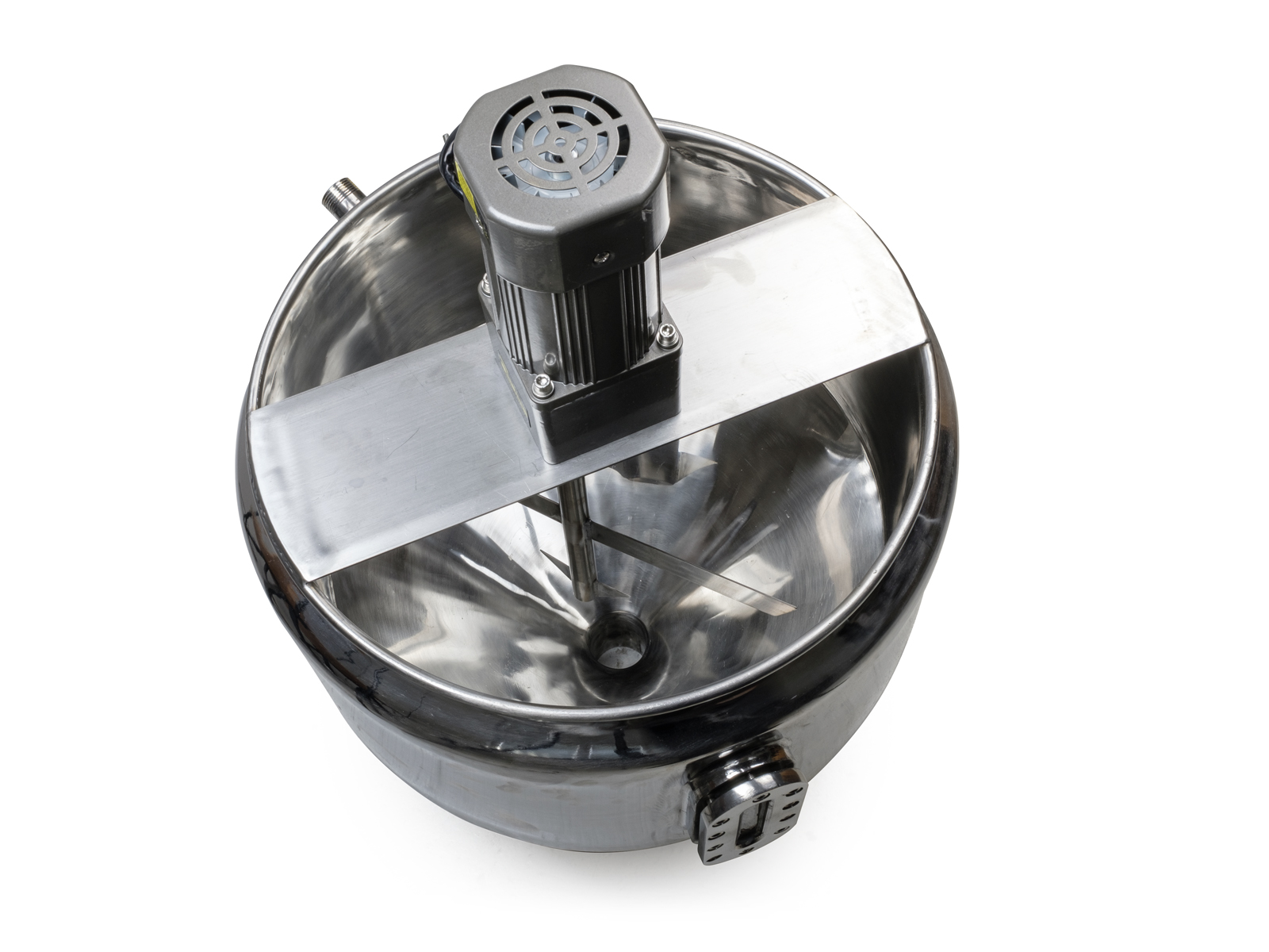 Nerezový dvouplášťový násypník o objemu 30L s ohřevem a míchačem pro dávkování medů, čokolád, parafínů a jiných viskózních látek a hmot pomocí pístových plniček.