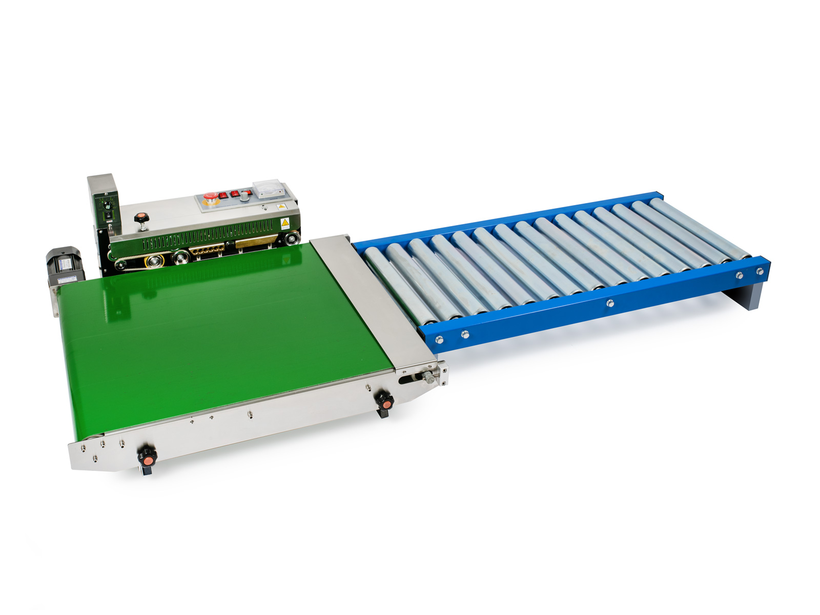 Kontinuálku DBF-770WL-385 s pásem je vhodné doplnit o válečkový dopravník pro zefektivnění a zrychlení manipulace velkých balení při svařování. Celý systém pak vytváří spolehlivý a rychlý způsob svařování a balení pytlů a sáčků. Systém dopravních pásu je nutné uchytit na vlastní konstrukci či stůl pro srovnání výšky pásu svářečky a válečkového dopravníku.