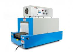 Malý jednokomorový smršťovací tunel BS-200 s dopravníkem pro tepelné smršťování svařených PVC, PP, PE, LDPE a POF polyolefinových obalů výrobků pomocí infračerveného záření, vhodný především pro smšťování menších balení do rozměru 175mm(š) x 110mm(v).