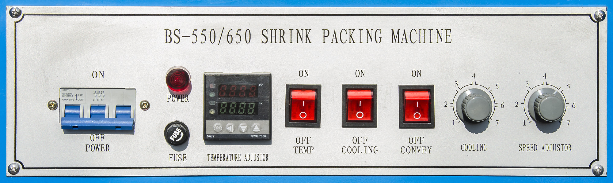 Ovládání smršťovacího tunelu je velice snadné, zařízení se zapíná pomocí třífázového jističe vyvedeného do řídícího panelu, dále nastavením požadované teploty, sepnutím výhřevu, sepnutím dopravníku a sepnutím cirkulace vzduchu. Rychlost dopravníku lze regulovat pomocí potenciometru od 0 - 10m/min. Rychlost dopravníku musí být v optimální rovnováze s nastavenou teplotou s ohledem na smrštovaný materiál, aby došlo k dokonalému smrštění fólie.