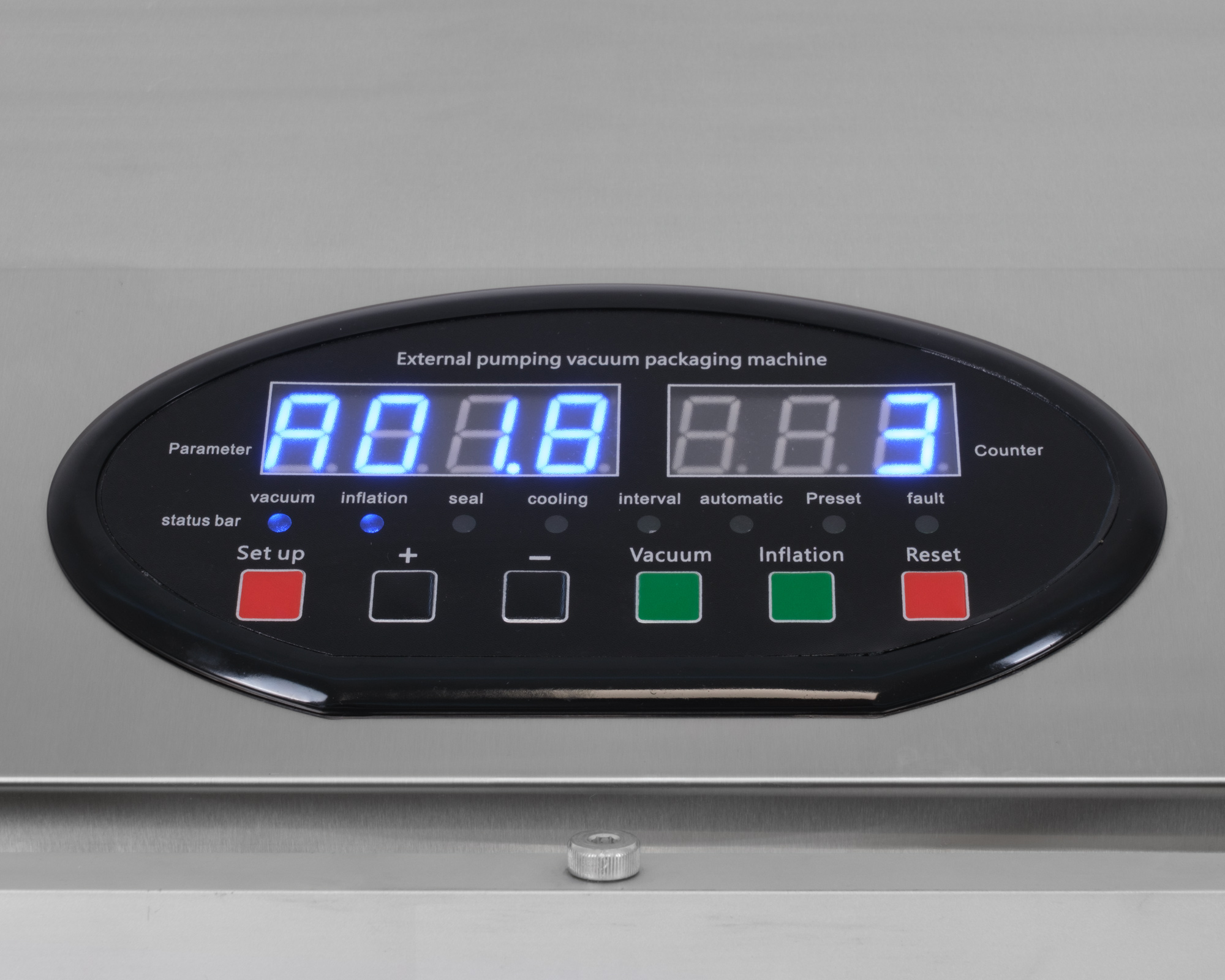 Všechny parametry procesu (čas svařování, vakuování i plnění plynem) lze nastavit v širokém rozmezí 0,1–99 sekund s jemným krokem po 0,1 s. Čas dochlazování sváru je nastavitelný samostatně od 4 do 99 sekund, rovněž v krocích po 0,1 s. Díky tomu lze proces přesně přizpůsobit různým obalovým materiálům i typům výrobků.