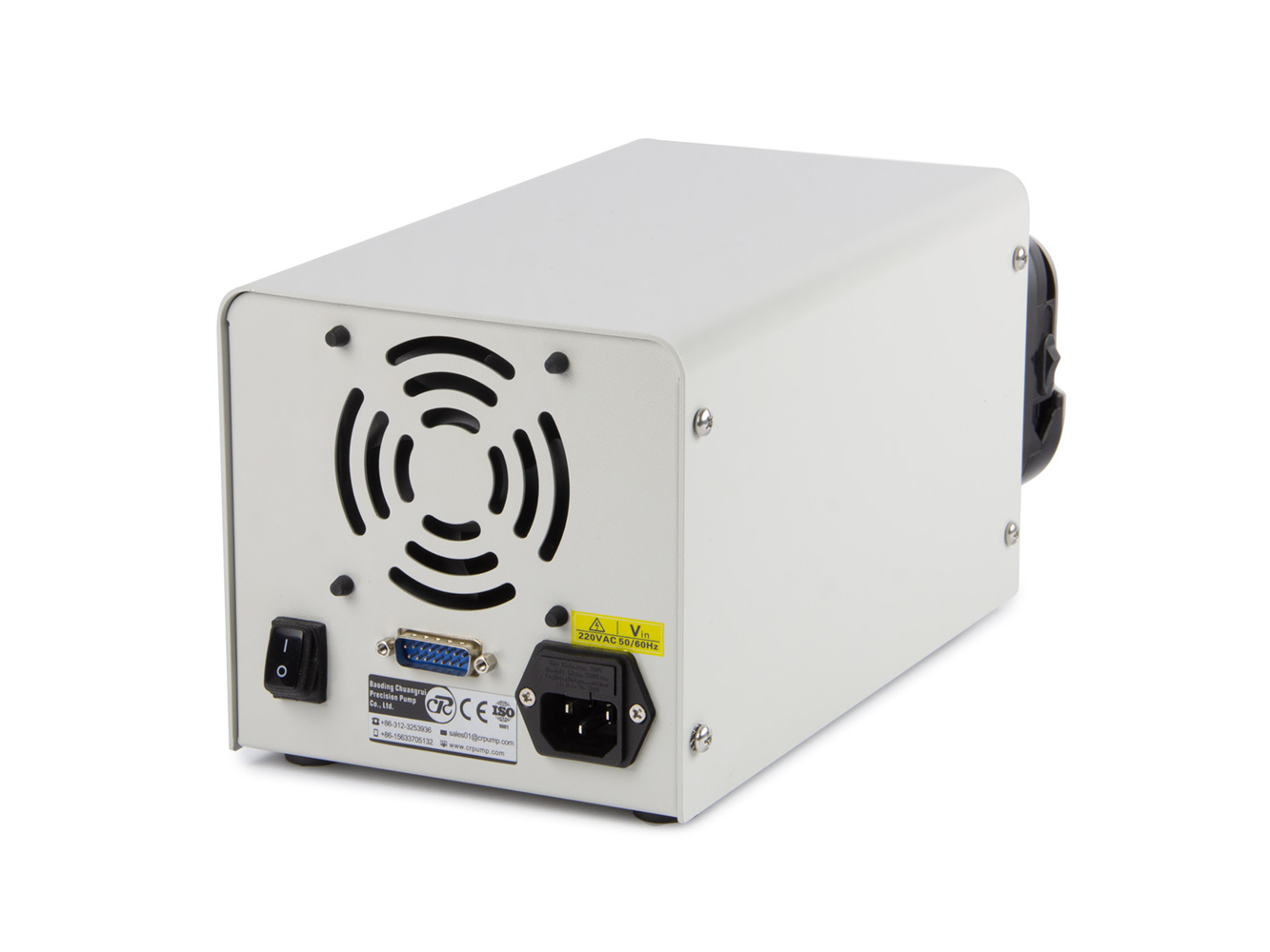 Peristaltický dávkovač je vyroben z kvalitních materiálů. Na zadní straně se nachází vstup pro napájení 230V/50Hz, voděodolný vypínač a 15PIN konektor pro pedál a komunikaci prostřednictvím protokolu RS485. Pumpa nevyžaduje žádnou speciální údržbu nebo častou výměnu mechanických částí, u pumpy je potřeba měnit pouze hadice pro transport kapalin u kterých díky ohýbání dochází k mechanickému opotřebení.