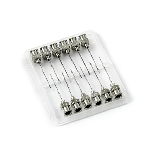 Tupé celokovové aplikační jehly s délkou kanyly 25,4 mm (1") pro přesné dávkování kapalin střední viskozity až k velmi viskózním. Ideální dávkovací hrot pro robotizované nanášení při tlaku do 6,8 baru. Tělo i náboj jehly je vyrobeno z nerezavějící oceli a v něm je osazena kapilára z ušlechtilé rafinované oceli. Při výrobě je kladen důraz na kvalitu povrchu a přesné dodržení vnitřních průměrů jehly a proto je povrch kapiláry elektrolyticky leštěn.