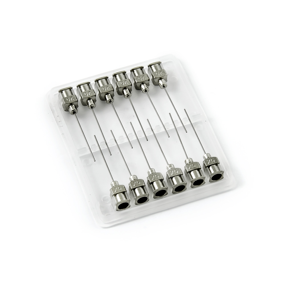 Tupé celokovové aplikační jehly s délkou kanyly 25,4 mm (1") pro přesné dávkování kapalin střední viskozity až k velmi viskózním. Ideální dávkovací hrot pro robotizované nanášení při tlaku do 6,8 baru. Tělo i náboj jehly je vyrobeno z nerezavějící oceli a v něm je osazena kapilára z ušlechtilé rafinované oceli. Při výrobě je kladen důraz na kvalitu povrchu a přesné dodržení vnitřních průměrů jehly a proto je povrch kapiláry elektrolyticky leštěn.