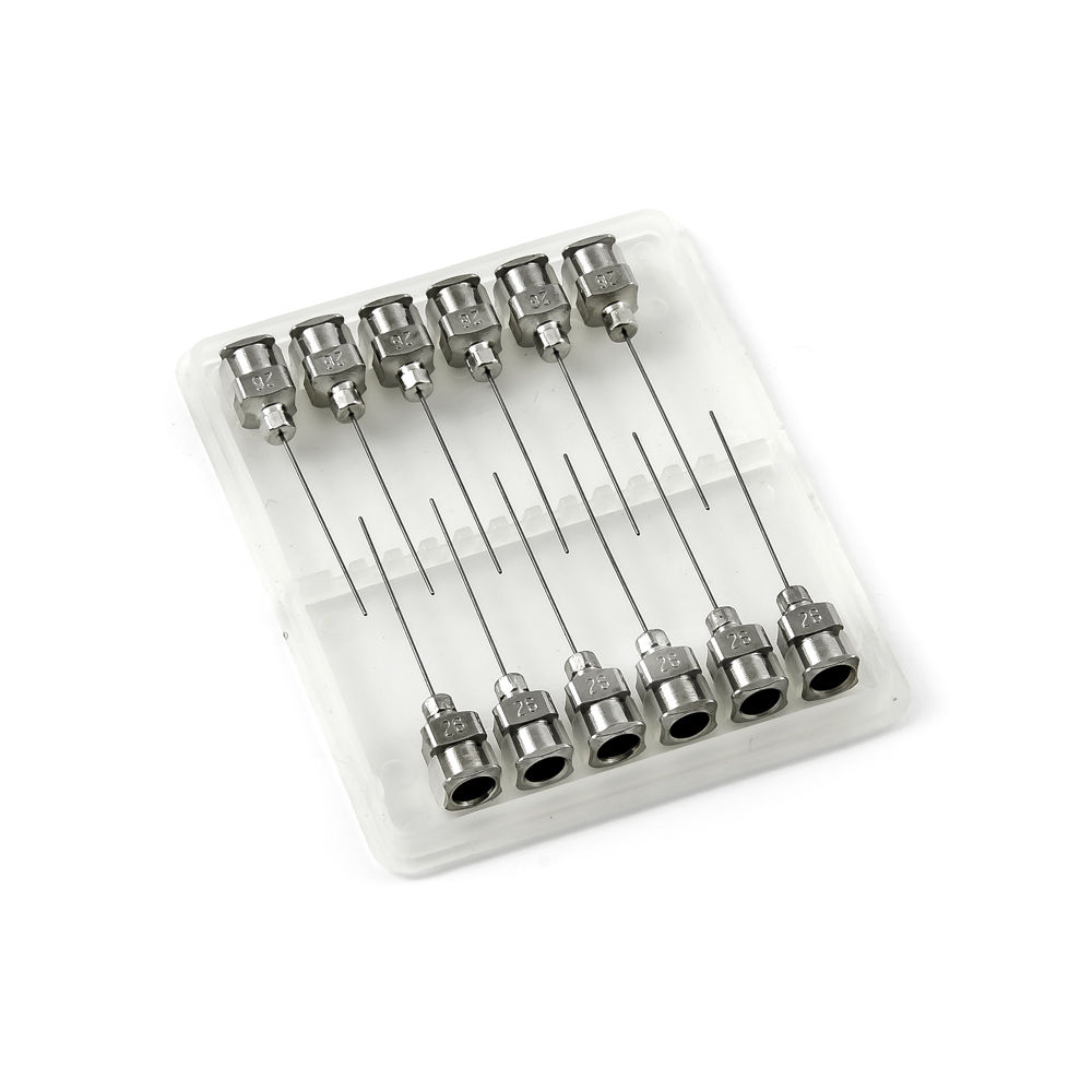 Tupé celokovové aplikační jehly s délkou kanyly 25,4 mm (1") pro přesné dávkování kapalin střední viskozity až k velmi viskózním. Ideální dávkovací hrot pro robotizované nanášení při tlaku do 6,8 baru. Tělo i náboj jehly je vyrobeno z nerezavějící oceli a v něm je osazena kapilára z ušlechtilé rafinované oceli. Při výrobě je kladen důraz na kvalitu povrchu a přesné dodržení vnitřních průměrů jehly a proto je povrch kapiláry elektrolyticky leštěn.