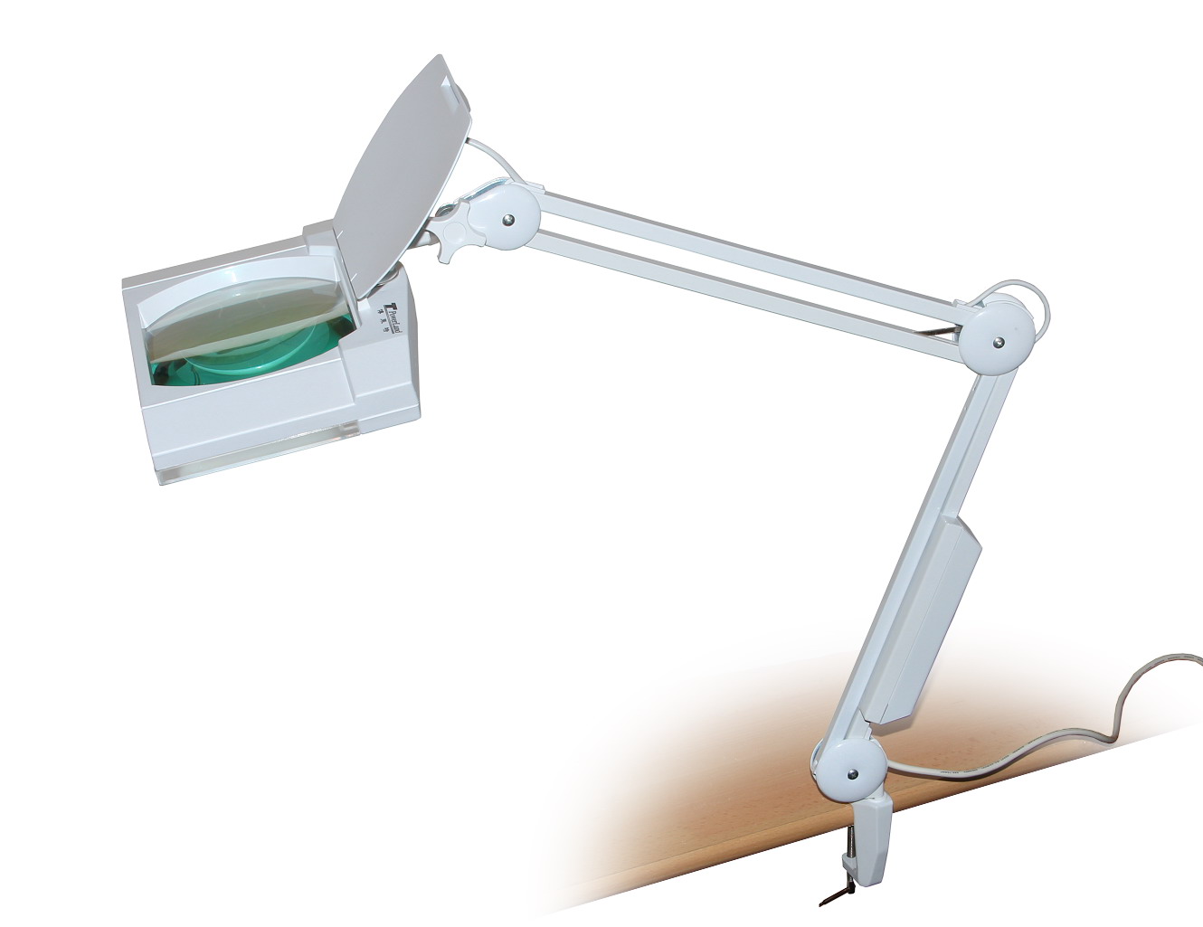 K desce stolu se rameno držáku uchytí pomocí svorky, která se přitáhne přes hranu stolu. O osvětlení pozorovaných předmětů se starají dvě úsporné katodové trubice s bílým světlem, umístěné zespodu po stranách zvětšovacího skla. Výkon svítidel 2x7W zajištuje dokonalé nasvícení objektů pod čočkou a to ze všech stran.