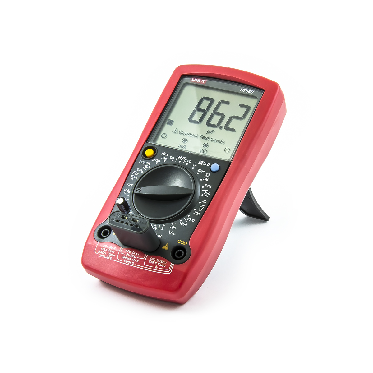 Profesionální digitální RLC multimetr UNI-T UT58D s velkým grafickým 3 a 1/2 místným LCD displejem s ikonami, s měřením všech běžných veličin a řadou nadstandardních funkcí. S multimetrem UNI-T UT58D změříte napětí do 1000V AC a 1000V DC, proud do 20A AC/DC, odpor, kapacitu kondenzátorů, indukčnost, vodivost (bzučák) a průchodnost diod. Nechybí ani test tranzistorů K dispozici je i tlačítko pro "zmrazení" displeje a uchování aktuálních hodnot na displeji k jejich snadnému odečtu. Po zvolení měřícího programu přístroj na displeji graficky znázorňuje, ke kterým konektorům by měly být připojeny měřící kabely, takže jeho ovládání je velice snadné a zvládne to i největší laik. Výška číslic na displeji je 22mm.