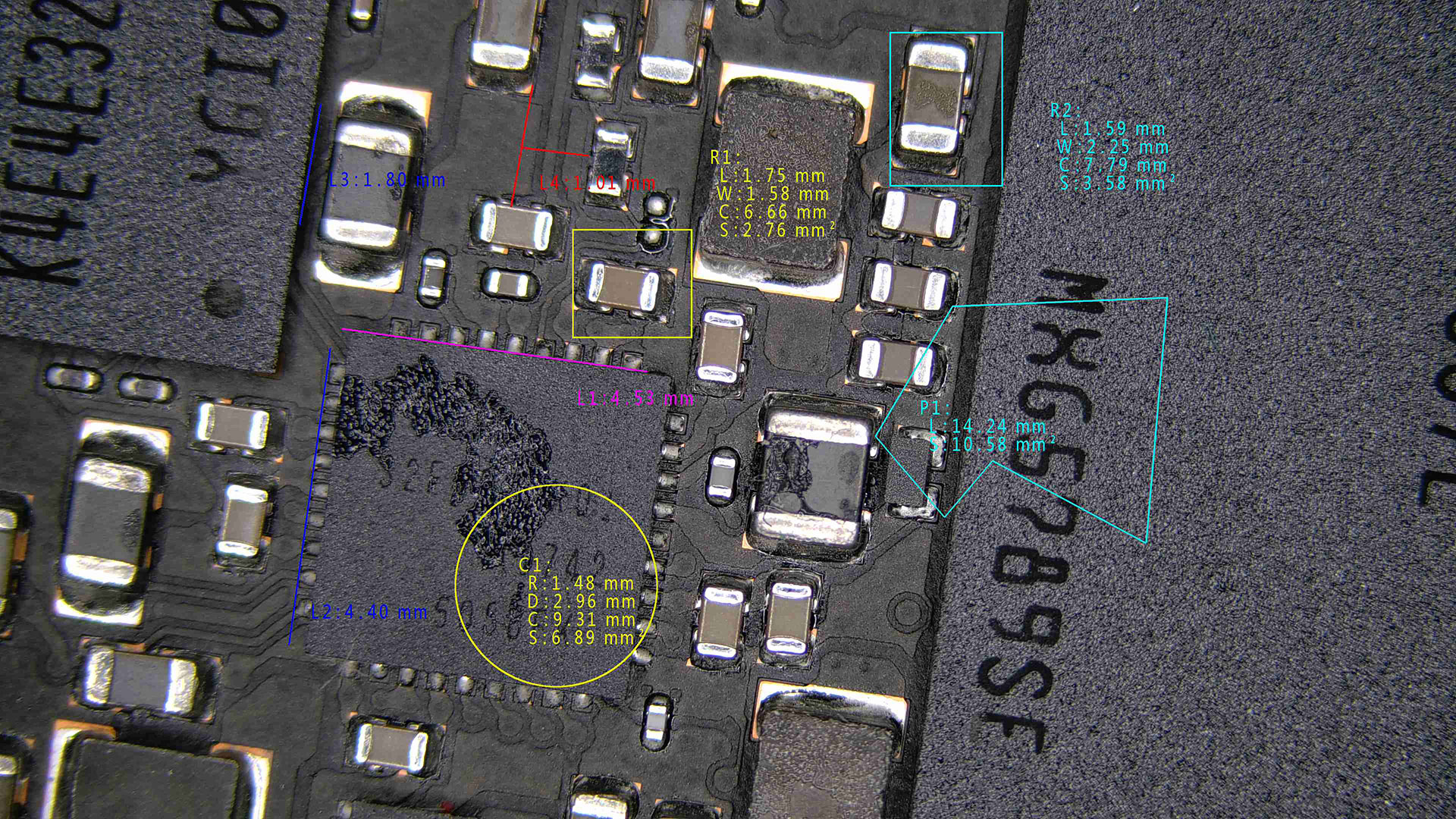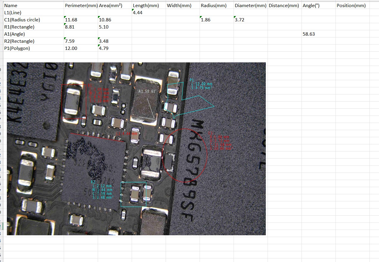 Velkou předností kamery je integrovaný měřicí software, který funguje nezávisle na počítači. Pomocí připojené bezdrátové myši (součástí balení) lze přímo na displeji zakreslovat čáry, úhly, kružnice, polygony a další geometrické útvary. Software uvnitř kamery zároveň zobrazuje i délky, úhly, obvody a obsahy, což značně urychluje dokumentaci a analýzu. K dispozici je i křížové pravítko přes celou obrazovku, výběr z osmi barev pro zvýraznění měření, možnost nastavení tloušťky čar i zobrazování měřítka a poměru zvětšení. Pro rychlé porovnávání slouží praktická funkce zmrazení obrazu na dvě nebo čtyři části.