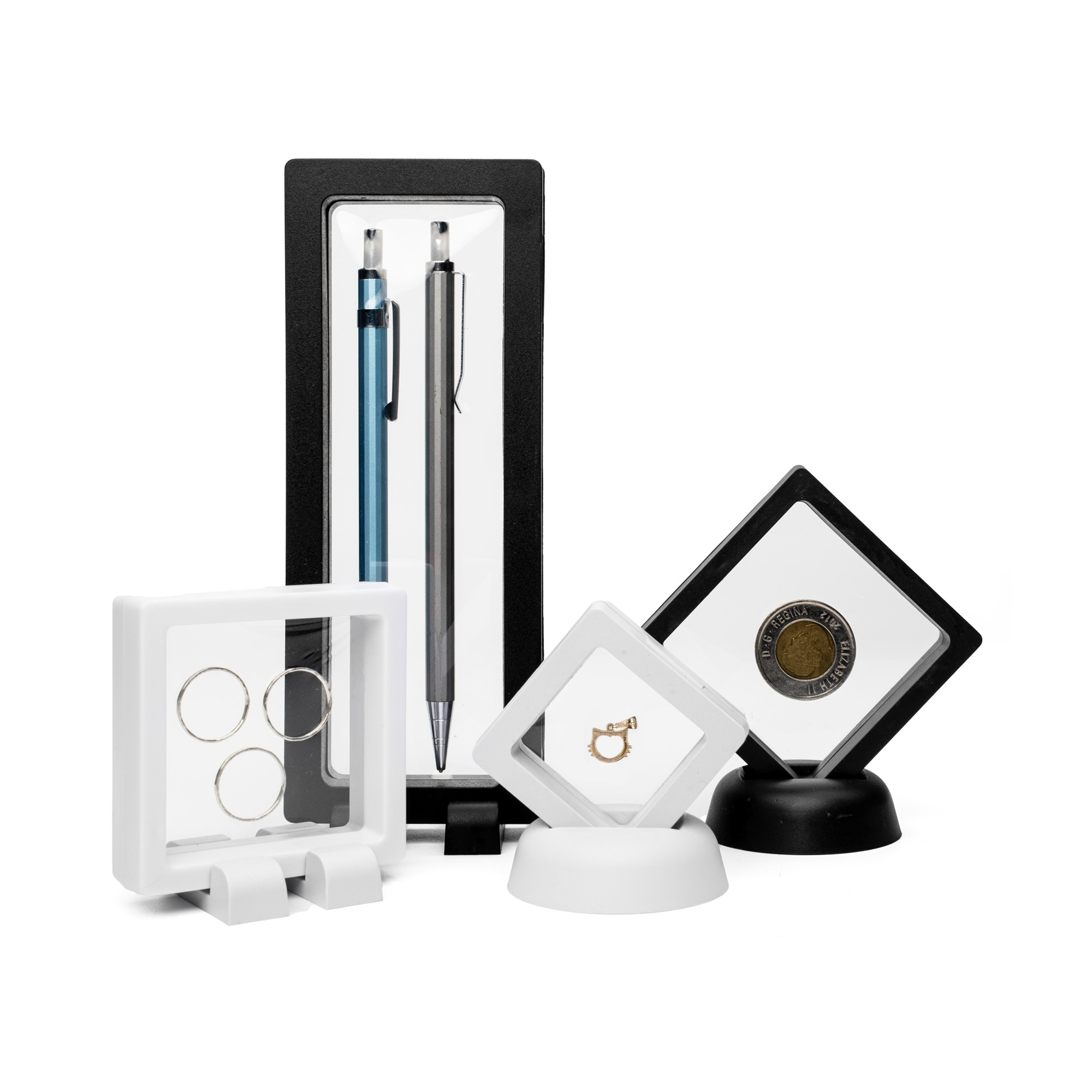 Plastový rámeček je rozevírací a skládá se ze dvou pevných polovin – na každé z nich je uchycena pružná transparentní silikonová membrána. Po otevření vložíte předmět dovnitř a rám zavřete. Membrány se spojí, jemně objekt obejmou a pevně jej udrží na místě. Díky mimořádné pružnosti se dokážou napnout až o přibližně 2-3 centimetry, takže snadno pojmou i vyšší nebo objemnější předměty. Stále přitom zůstává zachovaný efekt „levitace“ a úplné viditelnosti ze všech stran.