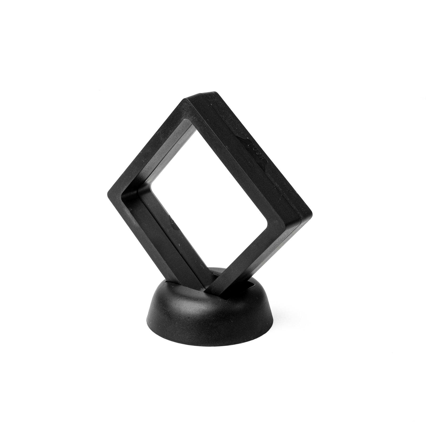 Stojánek v černé barvě pro 3D rámeček. Stojánek drží rámeček v poloze otočené o 45°, takže je orientovaný diagonálně – stojí na jednom rohu.