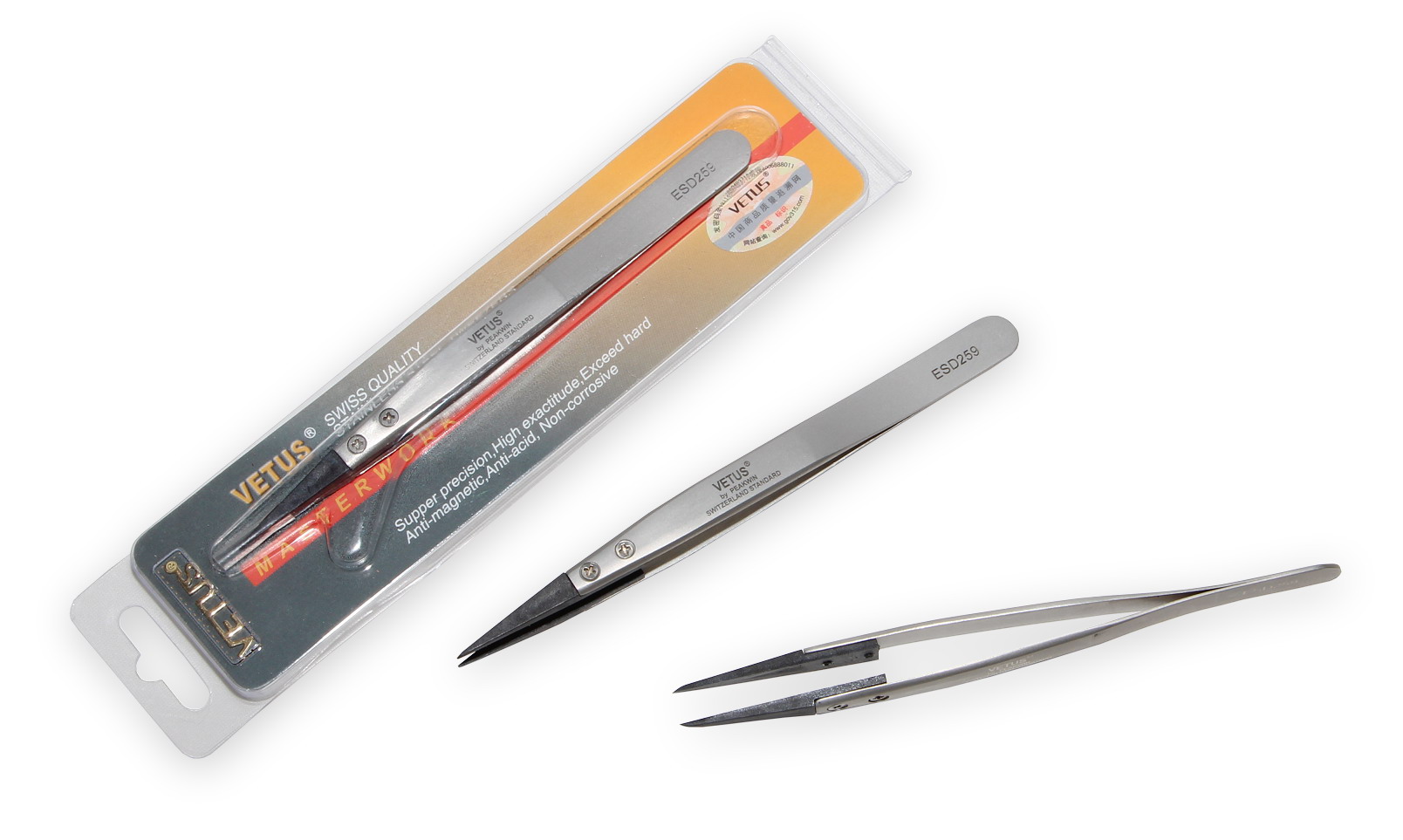Nerezová pinzeta se šroubovanými pacičkami z polyfenylsulfidových vláken (PPS). Tento materiál propůjčuje pinzetě jedinečné vlastnosti mezi než patří absolutní odolnost proti kyselinám, odolnost vůči teplotám do 170°C s tím, že nedochází k ohřevu kovové části. Dále je materiál antimagnetický, nekorozivní a antistatický. Kovová část pinzety je vyrobena z nerezavějící oceli 302.
