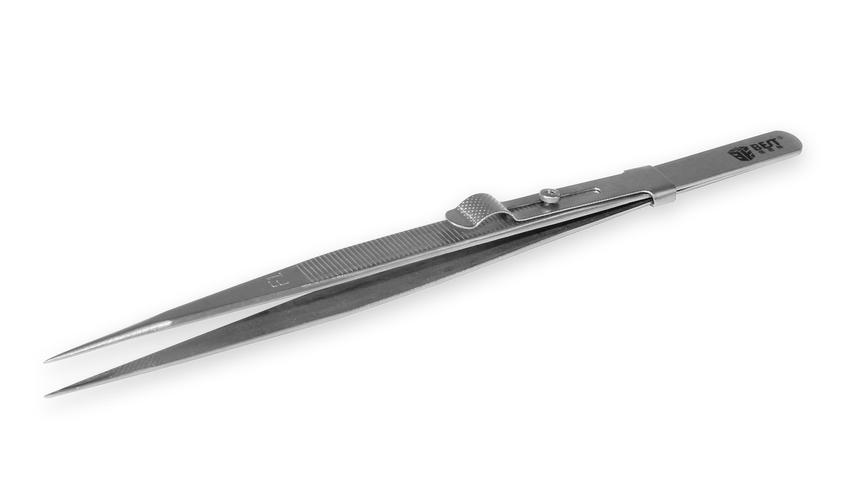 Velmi dlouhá pinzeta s aretací pomocí mechanického posuvníku. Dlouhá rovná pinzeta s drážkovanýma čelistma s posuvnou svorkou pro aretaci sevření čelistí. Posuvník se ovládá jedním prstem při držení pinzety. Nerezový materiál, ze kterého je vyrobena, je antimagnetický. Pinzeta s fixací je vhodná pro úchop elektronických součástek, hodinářské práce, klenotnictví apod.