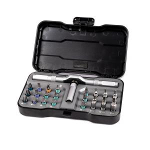 Sada obsahuje násadkový šroubovák s celkově 31 různými bity, které jsou umístěny v praktických policích, které lze tlačítkem z kufříku vysunout do svislé pozice pro jejich snadné odebírání. V zamčené poloze pak nehrozí vypadání bitů. Součástí šrubováku je také prodlužovací nástavec. Samotný šroubovák má ergonomickou pogumovanou rukojeť s protáčecí koncovkou, pro rychlé šroubování. V kuříku je dále kovový lámací nožík, samostatné šroubováky torx 0.8 a malý křížový šroubovák 1.5 pro miniaturní šroubky uvnitř elektroniky. Nechybí ani zahnutá špičatá pinzeta